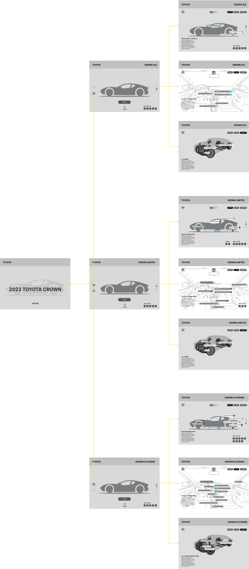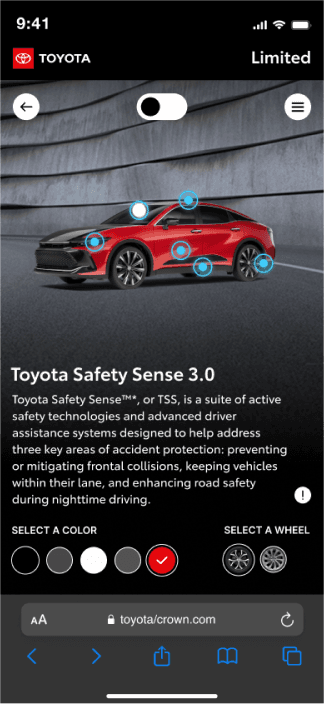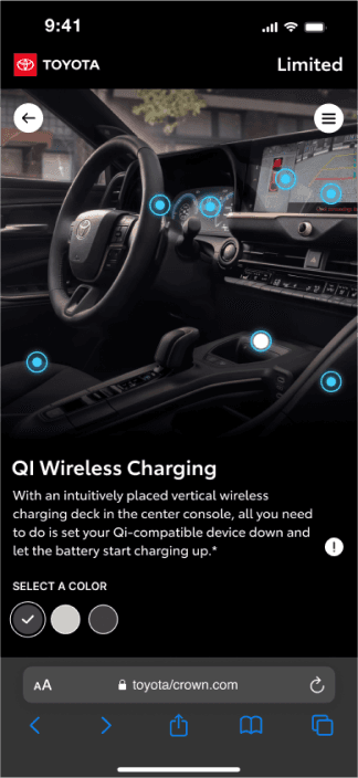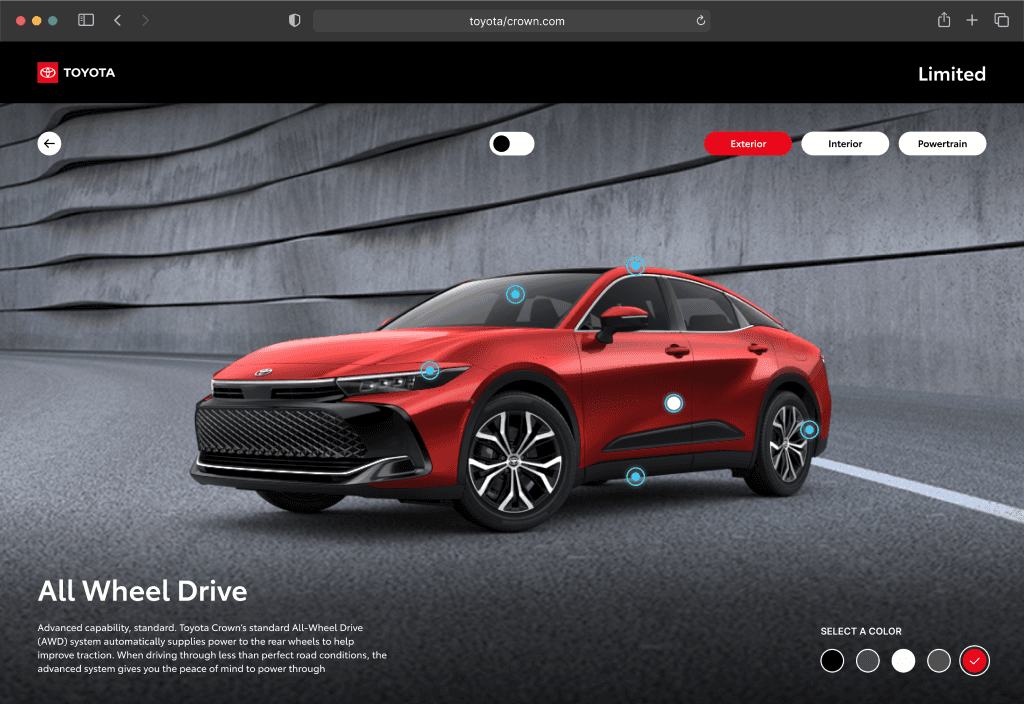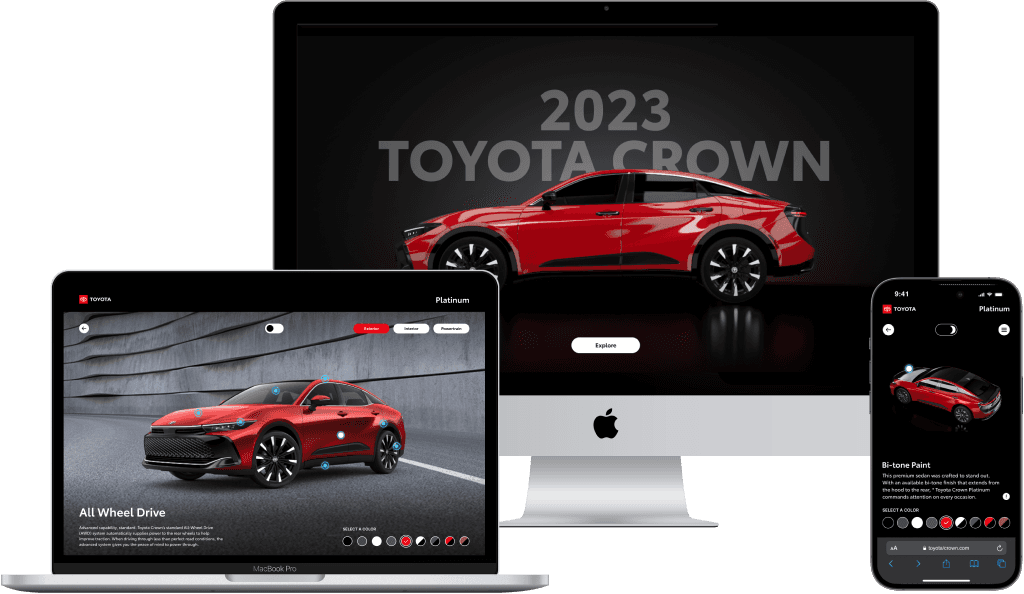 We designed an interactive WebGL experience that let users explore the Toyota Crown in 3D, personalize it with trim and color options, and discover key features through intuitive touchpoints—across desktop and mobile.